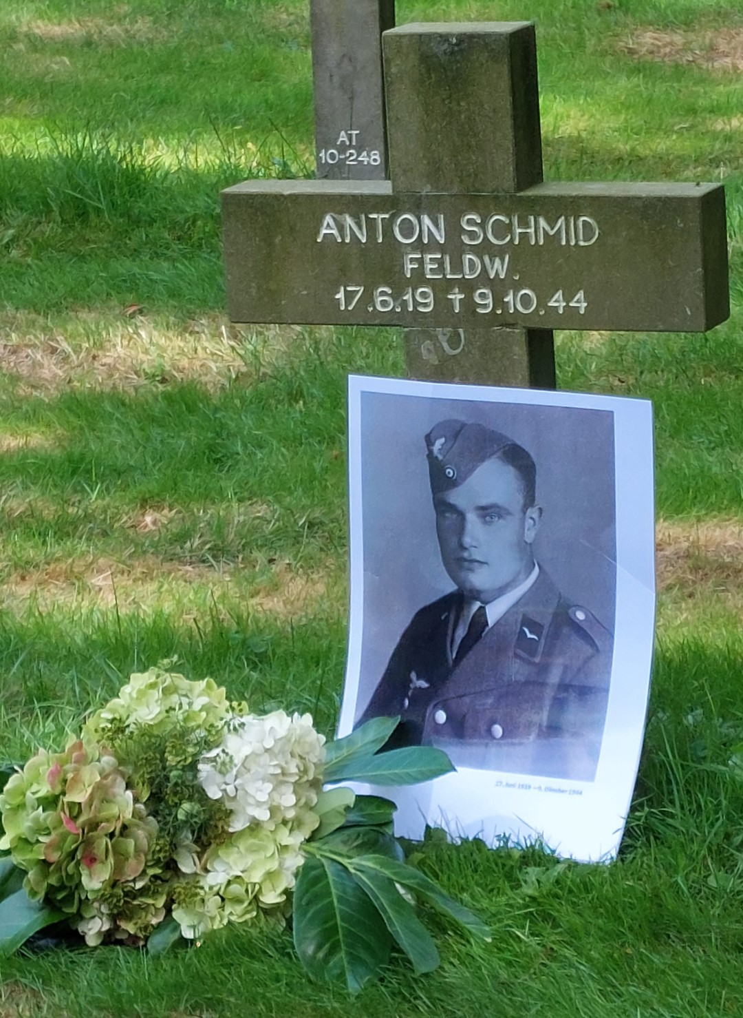 In der Jugendbegegnungs- und Bildungsstätte Ysselsteyn traf ich am 6. August eine Gruppe von Zeiss und erzählte ihnen am Grab meines Großonkels vom letzten Teil seiner Lebensgeschichte: Anton Franz Schmid ist Pilot und gerade mal 25 Jahre alt, als er 1944 in den Niederlanden auf einem Nachtflug mit einer anderen deutschen Kampfmaschine zusammenstößt und mit seiner ganzen Besatzung zu Tode kommt.